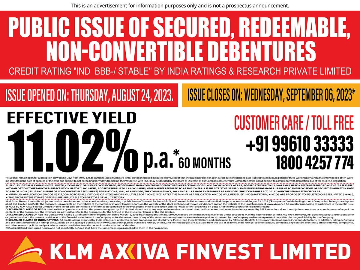 All the previous public issues of KLM Axiva Finvest Ltd in the past were oversubscribed and have achieved minimum subscription. Investors can apply for NCDs through the branches of the Company and through BSE online platform. Application forms are available at https://klmaxiva.com/ncd, BSE India Official website and Vivro official website. All investors proposing to participate in the public issue of NCDs by KLM Axiva Finvest Limited should invest only on the basis of information contained in the Prospectus. Please see the section entitled “Risk Factors” beginning on page 17 of the Prospectus for risk in this regard.