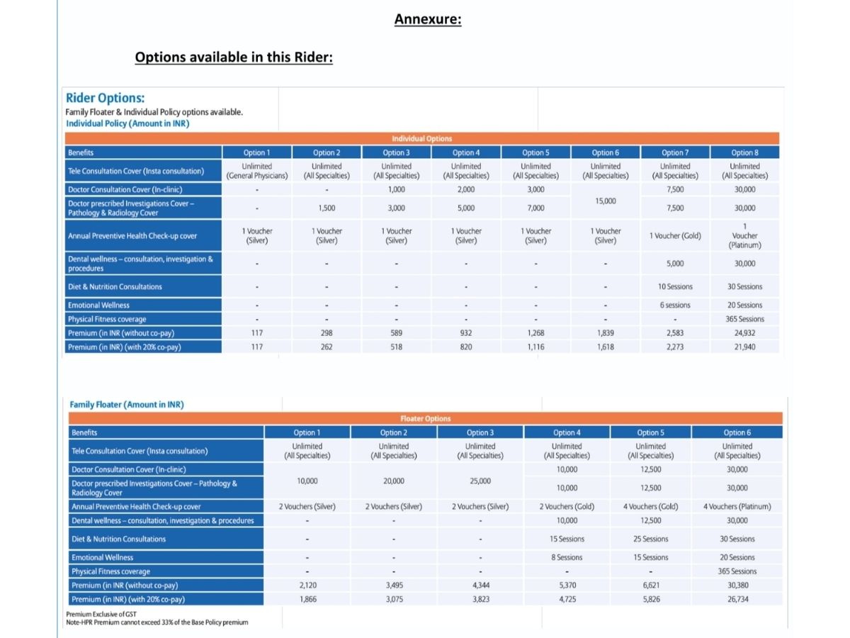 - The enhanced rider provides new coverages namely – Emotional Well-being, Dental Wellness, Diet and Nutrition Consultations, and Physical Fitness Cover – in addition to Tele-consultation Cover, Doctor Consultation Cover, Investigations Cover, and Annual Preventive Health Check-up Cover