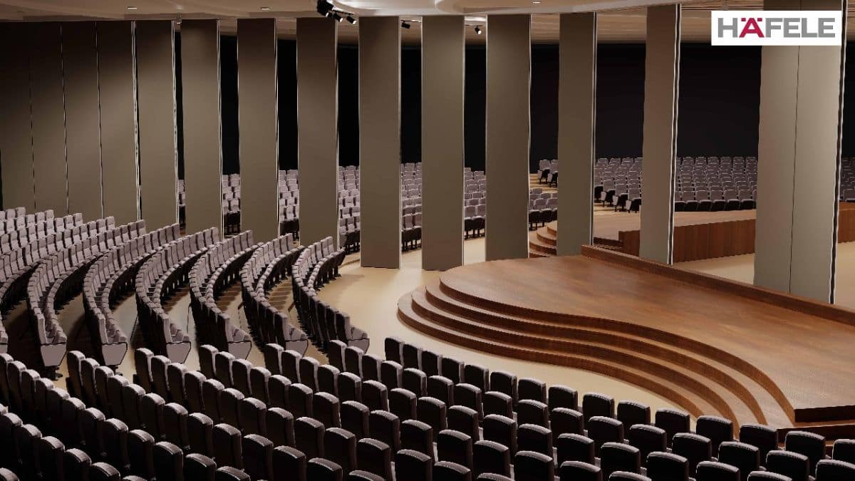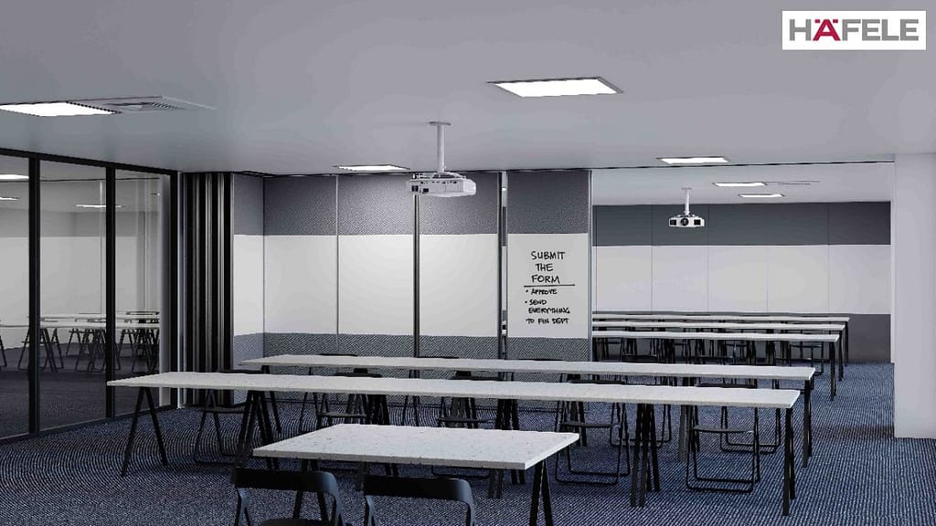This robustly executed movable wall system satisfies even the toughest requirements and proves that quality and design can be perfectly integrated. With Palace 110, you can achieve countless possibilities with regards to shape, material and colour. In consultation with Hafele, you can determine the parking positions and the lay-out of the track, tailored to your personal requirements. A high degree of sound insulation and fire resistance of up to sixty minutes can also be realised with this system! Hafele offers optimal support, not only during the design and construction process, but even after.